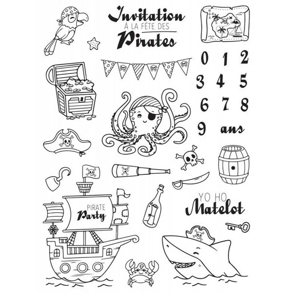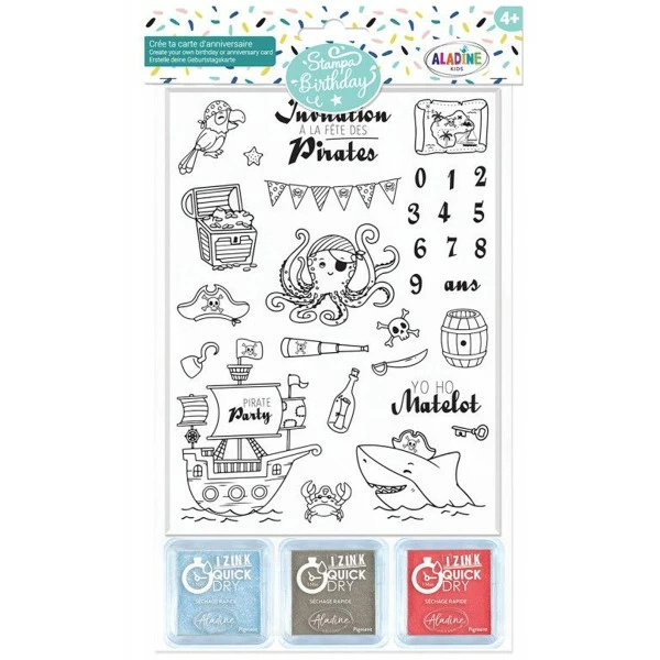 Description de Tampons Stampo Enfant – Anniversaire Pirate – 30 tampons + 3 encreurs