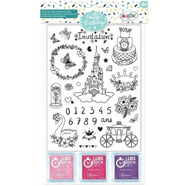 Cette année, votre enfant veut un anniversaire sur le thème Princesse ? Qu’à cela ne tienne, grâce à ce kit tampon Stampo Birthday d’Aladine, il pourra lui-même réaliser ses invitations sur ce thème.