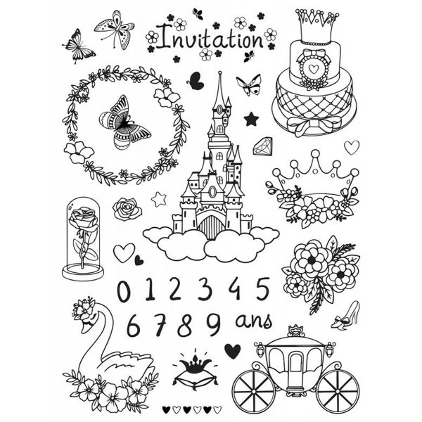 Données techniques pour Tampons Stampo Enfant – Anniversaire Princesse – 33 tampons + 3 encreurs