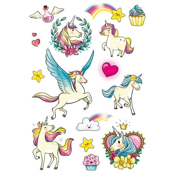 Cette planche de tatouage Tattoo Mania Licornes plaira beaucoup aux enfants à partir de 5 ans. Ces tatouages temporaires aux 15 motifs de licorne et de magie, sont spécialement conçus pour la peau sensible des enfants et testés sous contrÎle dermatologique. Vos enfants devraient adorer ces jolis tattoos faciles à coller sur leur corps !