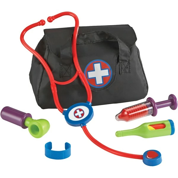 Ne t’en fais pas! Le petit docteur est sur place ! Le sac médical contient un stéthoscope, une seringue, un patch, un otoscope auriculaire et un thermomètre. Plastique souple et durable de haute qualité, idéal pour le jeu des tout-petits. Renforce la motricité fine, la coordination ?il-main, l’imagination et le langage