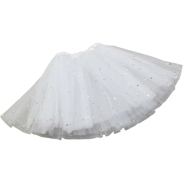 Jolie jupe en tulle blanc avec étoiles argentées et bord élastique en tissu fin satiné
