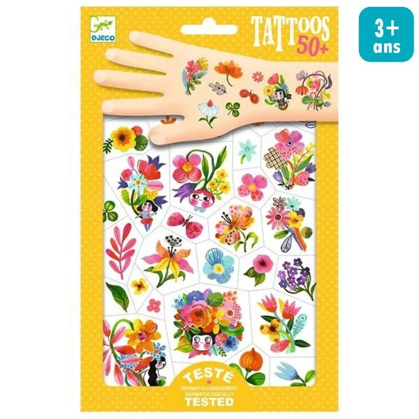 Cette planche de tatouages éphémères Aqua flor Djeco est parfaite pour embellir la peau des tout-petits, de jolis tattoos rigolos !