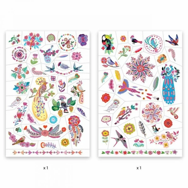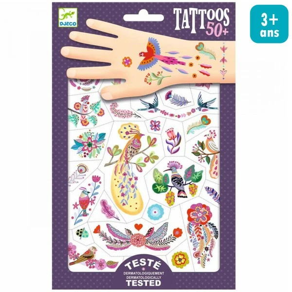 Cette planche de tatouages éphémères Plume color Djeco est parfaite pour embellir la peau des tout-petits, de jolis tattoos rigolos !