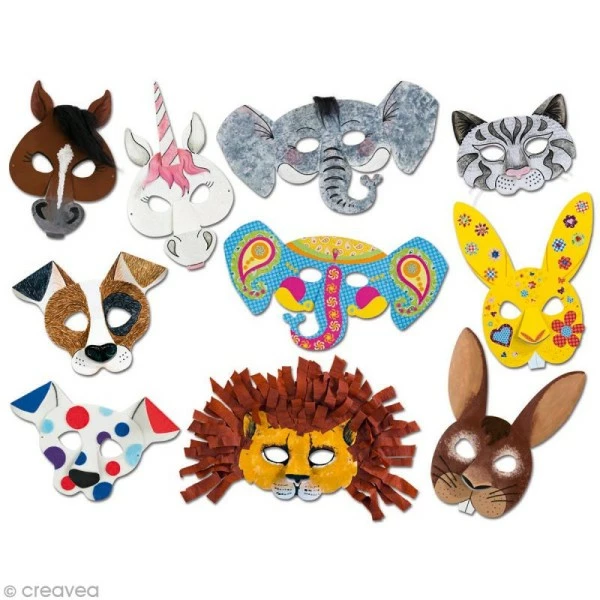 Assortiment de 6 masques à décorer sur le thème Animauxlapin, éléphant, chien, chat, licorne et dragon.