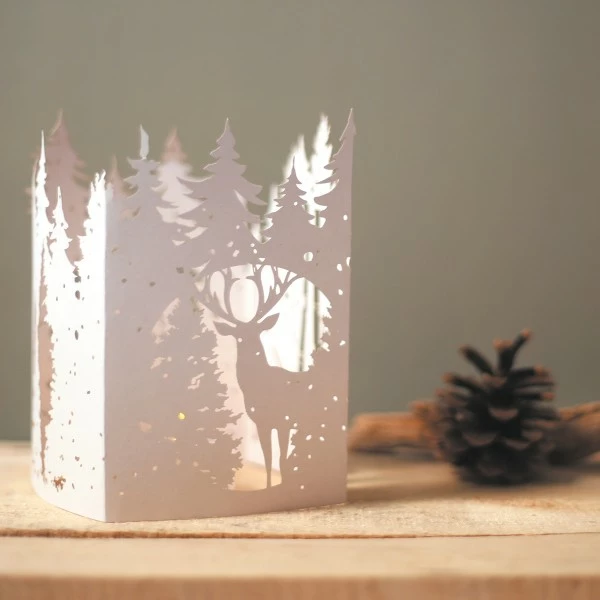 CrĂ©ez une jolies ambiance hivernale avec ce photophore en papier avec une scĂšne de forĂȘt. Avec ces jolis dĂ©tails ajourĂ©s, ce photophore de 15 x 10 cm s’intĂ©grera parfaitement dans votre dĂ©coration de NoĂ«l !