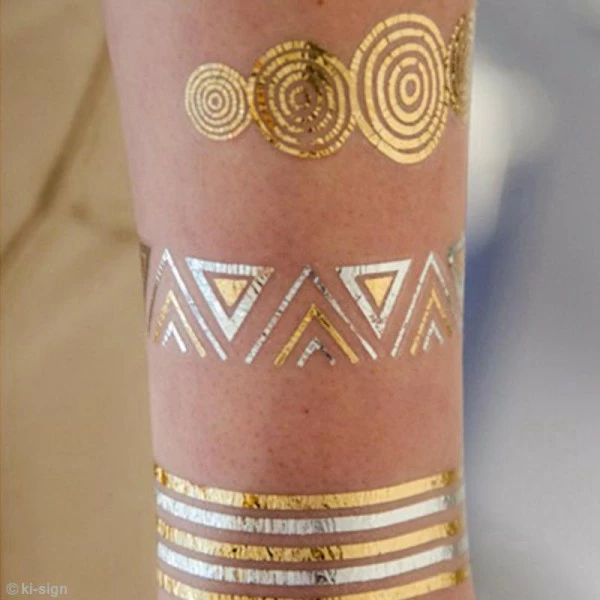 Cette planche de 15 x 9 cm contient environ 9 tatouages temporaires pour la peau sur le thème Love. Ces tattoos éphémères Ki Sign, dorés et argentés, seront du plus bel effet ! Ils mesurent entre 8 mm et 14 cm.