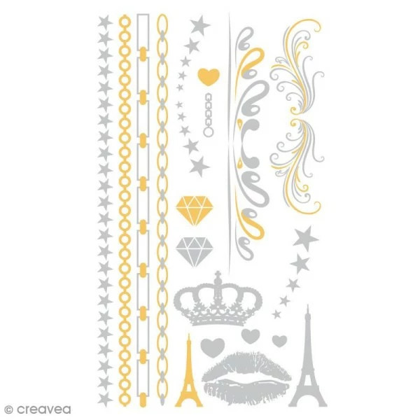 Cette planche de 15 x 9 cm contient environ 20 tatouages temporaires pour la peau sur le thème Paris. Ces tattoos éphémères Ki Sign, dorés et argentés, seront du plus bel effet ! Ils mesurent entre 3 mm et 14 cm.