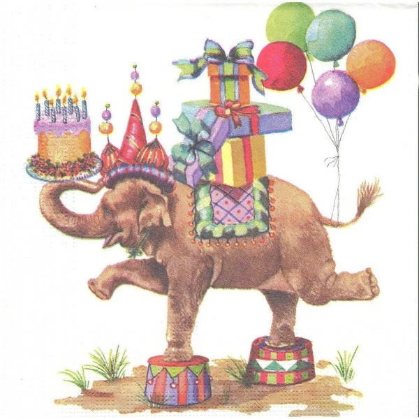Données techniques pour 4 Serviettes en papier Anniversaire éléphant Format Cocktail Decoupage Decopatch 6873 PPD