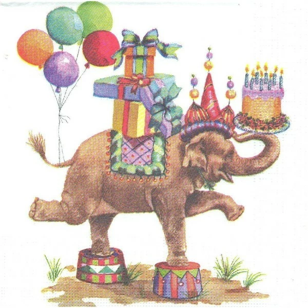Description de 4 Serviettes en papier Anniversaire éléphant Format Cocktail Decoupage Decopatch 6873 PPD