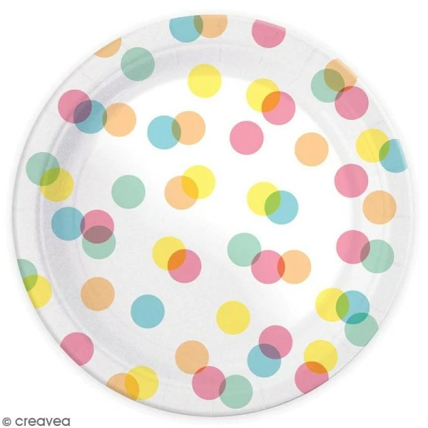 Ce lot de 8 assiettes cartonnées Confettis pastels est idéal pour décorer une table de fête : pour un anniversaire, un mariage, un baptême, ou même en décoration d’une sweet table ! Elles mesurent 23 cm de diamètre.
