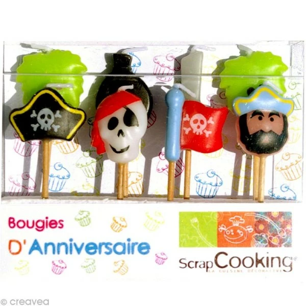 Le coffret de 8 bougies d’anniversaire Pirate fera le bonheur de tous les petits garçons. La forme des bougies Pirate ScrapCooking® est variée, vous trouverez 2 bougies palmier, une bougie bombe, une bougie en forme de sabre, une bougie tête de mort, une bougie chapeau de Pirate , une bougie tête de Pirate et une bougie drapeau de Pirate.