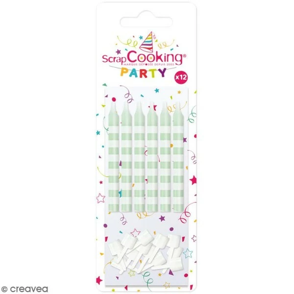 Les 12 bougies vert d’eau à rayures blanches, qui mesurent 10 cm de hauteur, sont livrées avec des supports prêts à être piqués sur vos plus appétissantes pâtisseries !