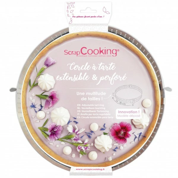 Grùce à ce cercle pùtissier extensible, réalisez des tartes de 16 à 30 cm de diamÚtre et de 3 cm de hauteur. Ce moule contient des bords perforés pour une cuisson uniforme et un démoulage optimal. Cercle gradué réglable.
