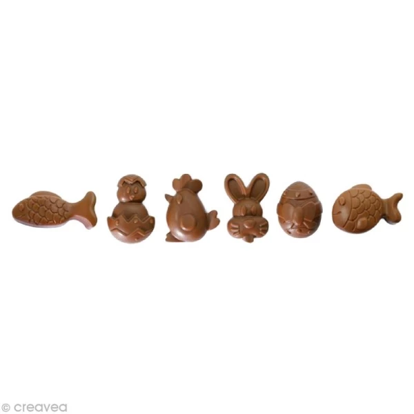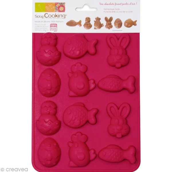 Créez vos chocolats de Pâques maison avec le moule Scrapcooking de 12 petits personnages ! A l’occasion de Pâques, des fêtes, ou juste pour le plaisir, faire des chocolats en forme de poussin, lapin, poule ou poisson, est très ludique et gourmand. Mais pas seulement ! Le moule de 12 petits personnages de Pâques peut aussi être utilisé pour mouler du caramel, de la pâte à sucre ou des pâtes de fruits !