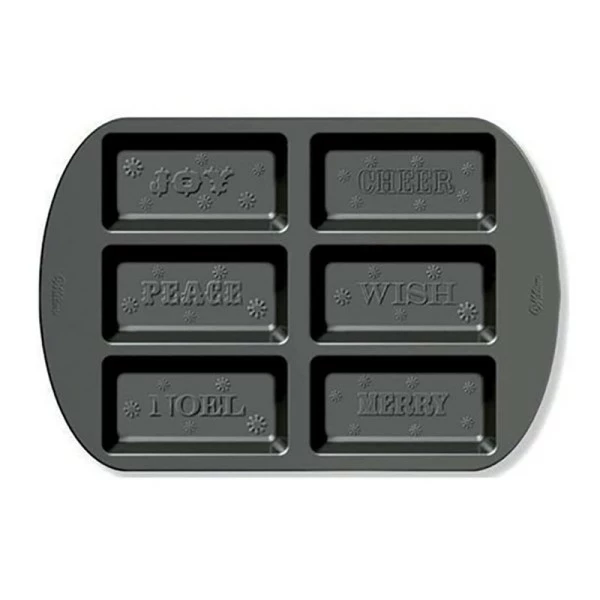 Moule de cuisson ave 6 cavitĂ©s Ă biscuits mots des fĂȘtes de la marque Wilton. RĂ©alisez de parfaits biscuits de fĂȘte avec ce moule Ă message comportant un revĂȘtement anti adhĂ©sif pour faciliter le dĂ©moulage. En versant la pĂąte dans les cavitĂ©s , vous pourrez crĂ©er 6 biscuits de 13,5 cm x 7.5 cm . Une recette est incluse sur l’emballage.